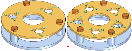 If you change the design of the part containing the feature pattern, the part pattern in the assembly updates. For example, if you increase the number of holes in the feature pattern, additional bolts are added to the part pattern in the assembly.