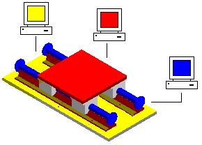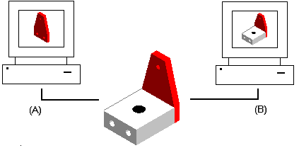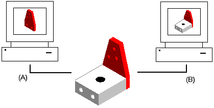 并行设计的另一个优点是有能力更新显示以查看其他用户对装配所作的更改。在下面的示例中,用户 A 可以打开装配中的一个零件。同时,用户 B 可以显示整个装配的只读版本。