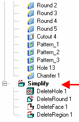 The features you create in the Simplify Model environment are added to the Simplify section of the PathFinder tab in the part document. You can also use the commands on the shortcut menu within PathFinder to manipulate the simplified features you construct.