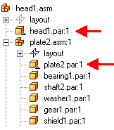 The symbols adjacent to each part in the PathFinder tab in an assembly change to indicate whether the simplified version or designed version of the part is currently displayed.