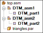 Example:The example below shows two virtual parts, each contained in a virtual assembly. When published, the subassemblies each have a part document containing a solid body representing the digital terrain model.