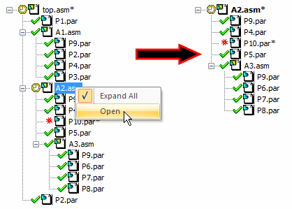 You can update parts starting at a lower level in the Component Tracker dialog box using the Open command on the shortcut menu of a assembly component.