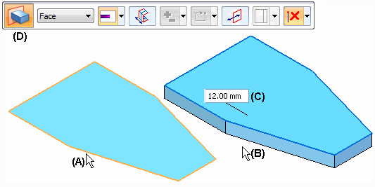 You can use the Select tool to select a sketch region (A). The Extrude tool (B) is automatically displayed, which allows you to define the extent direction for an extruded feature. The dynamic input box (C) allows you to type a specific value for the feature thickness. Alternately, you can use the options on command bar (D) to specify that you want to construct a revolved feature instead.