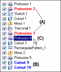 Shows the parents (A) and children (B) for a selected feature (C). You can select the feature in the graphic window or in Feature PathFinder. The parents and children are displayed in Feature PathFinder using the Parent Feature and Child Feature colors. You can set these colors using the Colors tab on the Options dialog box.