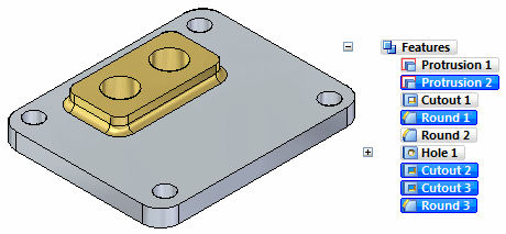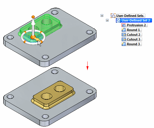 For example, you can create a user-defined set that includes an extruded feature, two cutouts on the extruded feature, and the round features between the extruded feature and the rest of the model.