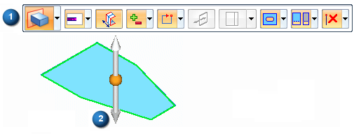 In the synchronous environment, you can use the Select tool to construct extruded features. When you select a valid sketch element, such as a sketch region, both the Extrude command bar (1) and the extrude handle (2) appear.