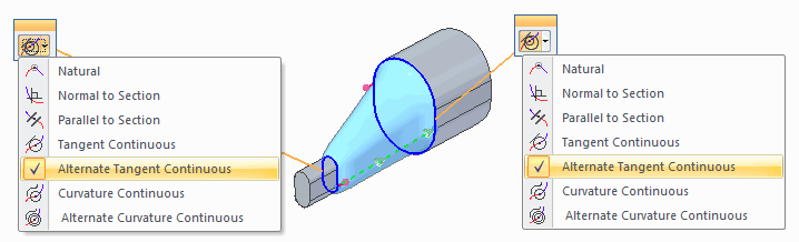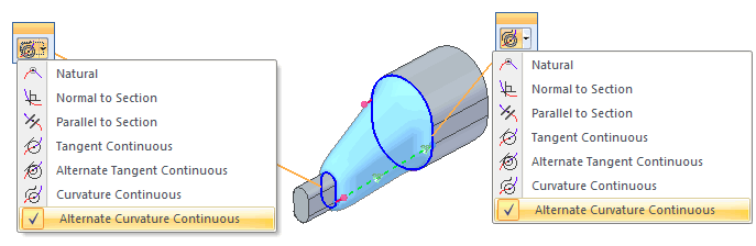 End cross sections defined using part edges and construction surfaces support a alternate curvature continuous condition. The tangent vector for the surface is determined by the alternate face at that end. You can control the length of the vector using the variable table or by modifying the vector handle in the graphics window.