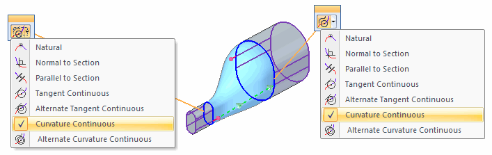 End cross sections defined using part edges and construction surfaces support a curvature continuous condition. The tangent vector for the surface is determined by the adjacent surfaces. You can control the length of the vector using the variable table or by modifying the vector handle in the graphics window.