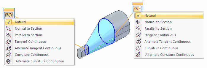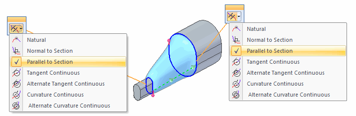 Specifies the options you want for controlling the shape at the ends of the feature. For example, when you are creating a BlueSurf feature that must blend smoothly with adjacent surfaces, you can set the Normal to Section option to ensure a smooth blend between the existing surfaces.