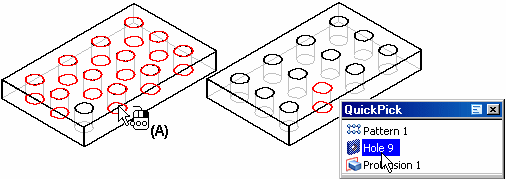 You can suppress pattern occurrences in rectangular and circular patterns with the Suppress Occurrence button on the command bar. With the profile window open, select the pattern profile, and then click the occurrence symbols to specify which occurrences you want to suppress (A). The symbols change size and color to indicate that the corresponding occurrences are suppressed.