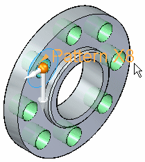 You also define the axis of rotation for the circular pattern when positioning the pattern profile. For example, to place a circular pattern of the hole shown, the center of the circular planar face that the hole pierces is appropriate. In this example, use the Keypoints option on the command bar to make it easier to position the axis of rotation handle at the center point of the circular model face.