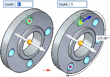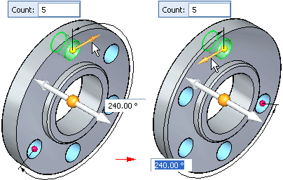 If you specify a partial circular pattern, you also specify the sweep angle of the arc and the pattern direction. The pattern direction controls whether the pattern occurrences are copied in a clockwise or counter clockwise direction. You specify the pattern direction by clicking the direction arrow, as shown below.