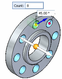 You can also use the Fixed option to create a full circular pattern where the angular spacing between the parent feature and the last occurrence is less than the defined angular spacing. For example, with a pattern count of 8, and a defined angular spacing of 47°, the angular spacing between the parent feature and the last occurrence will be 31°.