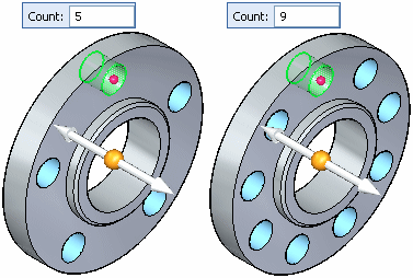 You can use the command bar and the dynamic edit boxes in the graphics window to define the pattern parameters you want. For example, you can change the number of occurrences using the Count box, and whether a partial or full circle pattern is constructed. Use the Full Circle and Partial Circle options on the command bar to specify a full or partial circular pattern.