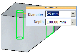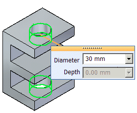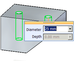 If you select the handle of the hole on the right, you can change the diameter of the hole, but not the depth of the hole.