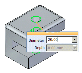 If you select the handle of the hole on the left, you can change the depth and diameter for the hole.