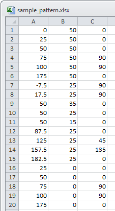 The Excel spreadsheet contains an XY position and a rotation angle for each pattern instance. Column A contains the X distance from the selected reference point. Column B contains the Y distance from the selected reference point. Column C contains the rotation angle of the pattern instance. Each row is a pattern instance definition.