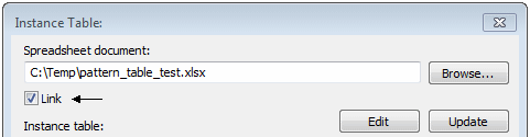 An Excel spreadsheet can either be linked to the file or embedded in the file. First browse for the Excel spreadsheet that drives the pattern. When the Link check box is selected, the spreadsheet is linked to the file. Clearing the Link check box embeds the Excel spreadsheet in the file.