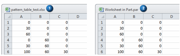 The first row in the Excel spreadsheet defines the master reference coordinates and is displayed as the first row in the Instance Table dialog box. The orientation of all pattern instances is calculated relative to that of the master instance.
