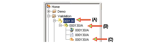 Each object must have a unique identifier (ID). For Items, this is called an Item ID. In the following example, the Item ID for the Item (A) is 000130. The Item Revision (B) for this item is A, which adds a unique Revision designation, followed by the Dataset (C) and its Item Name.