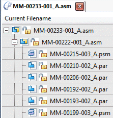The symbols in the document tree indicate the source of the components in the assembly. The document tree can include the following: