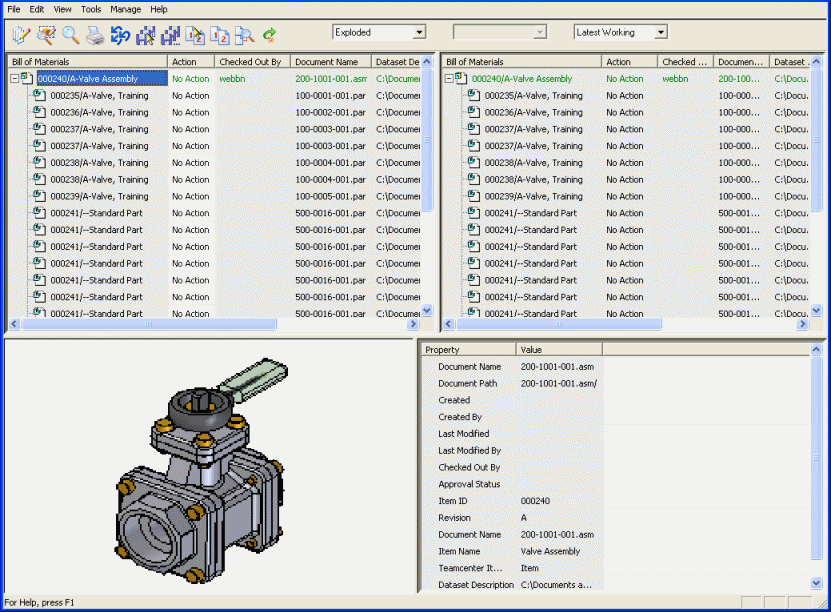 The lower-left and lower-right window panes contain preview and properties information. If an assembly is saved with a preview, the preview image is displayed in the lower-left window pane. Teamcenter properties display in the lower-right pane. You can resize each window pane individually to adjust the viewing area.