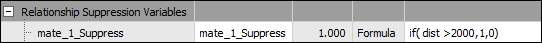 An example of a conditional statement in a variable table formula is shown below. In the example, if the variable dist is greater than 2000, the mate_1_Suppress value determines if the relationship is suppressed. If the formula returns a 1 (one), the value is suppressed. If the formula returns a value of 0 (zero), the value is unsuppressed. Shown below is the suppression variable when dist is equal to a value of 3000.