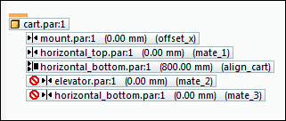 Once at the same level with part 3, the cart will move horizontally to the initial position. The mate relationship with part 2 then becomes suppressed and the mate with part 3 becomes unsuppressed.