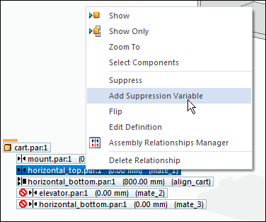 To establish the suppression variables, select each mate relationship that requires a suppression variable and use the Add Suppression Variable command to add it.