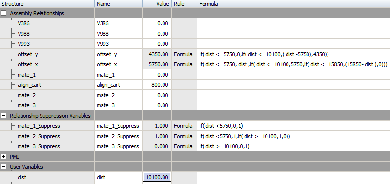As the variable dist is incremented by the variable table motor, formulas control the behavior of the suppression variables and the offsets required to move the parts. Conditional IF statements, similar to those found in Excel are used to control the suppression variables.