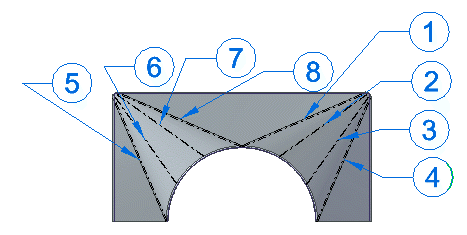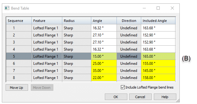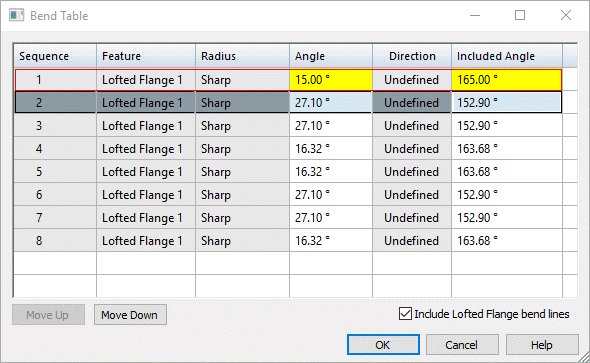 You can use the Include Lofted Flange bend lines option on the Bend Table dialog box to include triangulation hit lines, which treats the bends individually and includes an entry for each bend in the table.