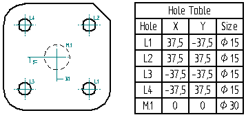 Hole tables are a useful means of identifying the size and location of holes in a part. A hole table works much like a software spreadsheet. Holes are represented as rows in the table and dimensions of the holes as columns. Hole tables support simple 2D geometry from circles and arcs, as well as 3D model features of holes, threaded holes, and patterns.