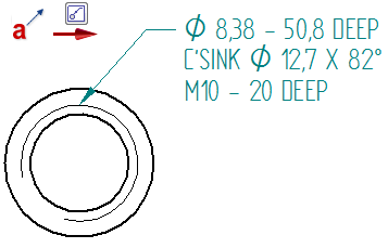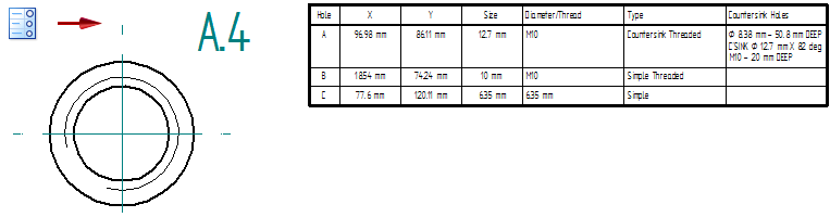 The following example shows how you can provide details about a hole in a table column (Countersink Holes), showing only a hole reference ID (A.4) in the drawing view.