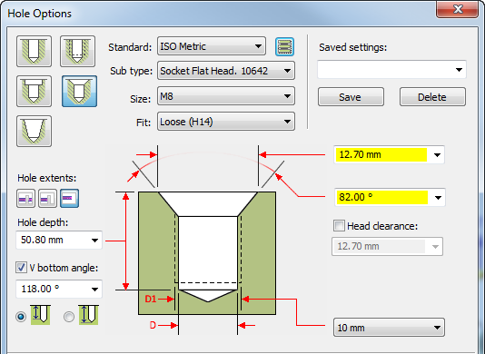 You can extract the ISO Metric standards-based hole type, size, fit, dimensions, and as-designed depth from the model into the Hole Callout 1 column. This information comes from the top portion of the Hole Options dialog box, as shown here for this countersink hole placed with the Hole command.