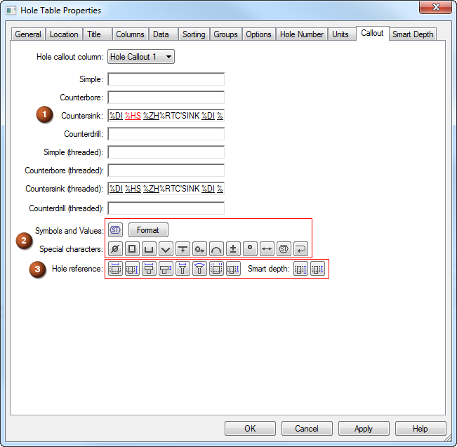 Note:This is where you create a cross-reference between the Smart Hole Depth (%ZH) and Smart Thread Depth (%ZT ) information you entered on the Smart Depth tab and the property strings you define for each type of smart hole on the Callout tab.