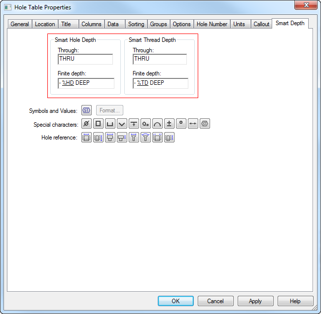 First, add the property text strings to the Smart Hole Depth and Smart Thread Depth boxes on the Smart Depth tab.