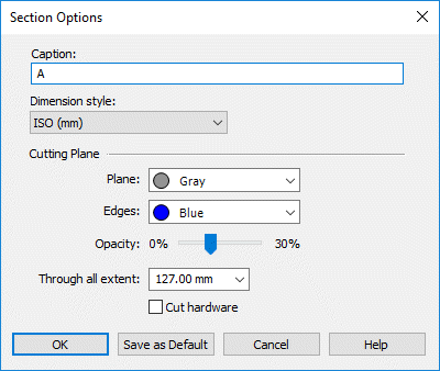 These cutting plane options—Plane, Edges, Opacity, Through All Extent, Cut Hardware—can be saved as default section annotation settings if you click the Save As Default button on this dialog box.