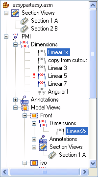 Tip:To locate a PMI element you added, expand the Dimensions or Annotations collection under the model view name. In this example, dimension Linear2x was added to model view Front.