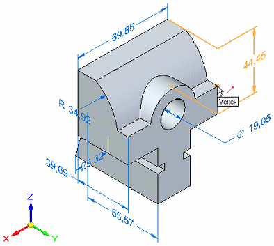 The Move Dimension command moves PMI dimensions and annotations. They move in a direction that is normal to the plane where they reside, adding extensions to the projection lines as needed.