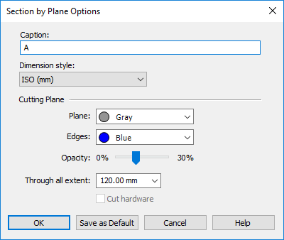 These cutting plane options—Plane, Edges, Opacity, Through All Extent, Cut Hardware—can be saved as default section annotation settings if you click the Save As Default button on this dialog box.