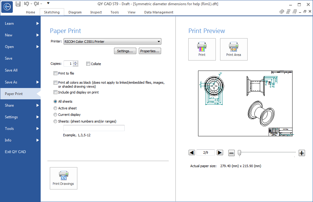 The Paper Print page on the Application menu contains all of the 2D print commands and related functions for printing any QY CAD document to paper or to a file. The left and right panes on the Paper Print page group similar functions and make them visible and available without having to navigate additional menus.