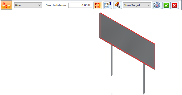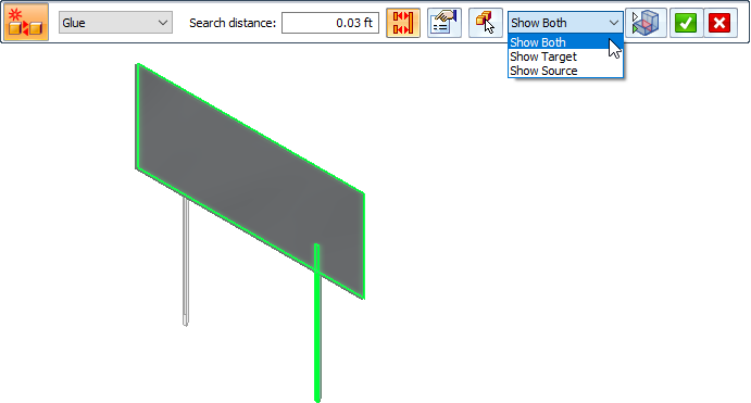 When creating and editing connectors, you can use the Visibility Options list on the command bar to review the connected faces in each contact pair. For the currently selected connector pair, it highlights and shows the target face (red highlight), the source face (blue highlight), or both faces (green highlight).