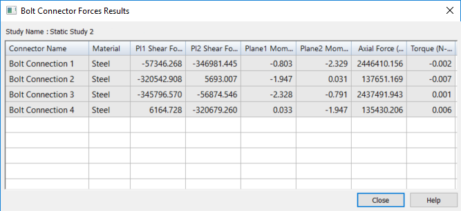 Example:If you used the Multiple Bolts option to create the connectors for a set of holes with the same diameter, then the table lists all four bolts by the same name (Bolt Connection 1), but it reports the unique stresses for each of the simulated bolt connections.
