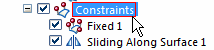 If the constraint symbols are not visible or if there are multiple constraints, you can first expand the Constraints group in the Simulation pane, and then select the constraint by name. This highlights the symbols associated with that constraint in the graphics window.