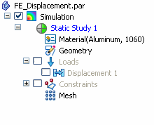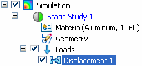 The duplicated study is added at the bottom of the Simulation study navigator pane and named Static Study 2. The displacement load and fixed constraint are copied with it.