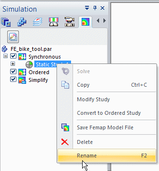 Tip:You can quickly duplicate solved studies using the Create Copy command. This command copies everything in the study, including geometry, loads, constraints, connectors, meshes, and results.