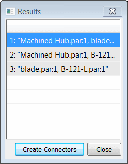 The list in the Results dialog box shows three pairs of connectors. Select all three entries and click the Create Connectors button.