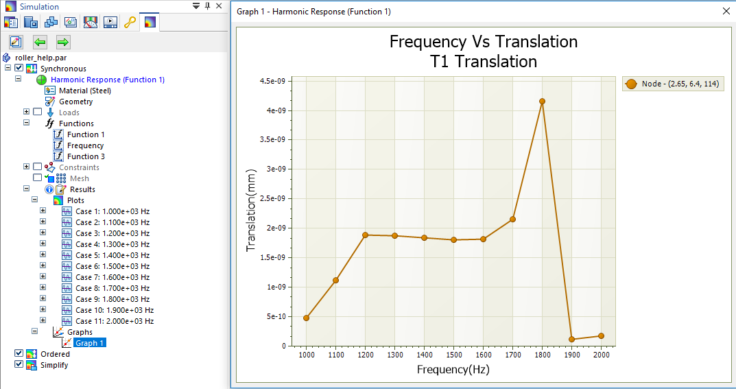 This graph of Frequency Vs. Translation shows the maximum displacement at the highest frequency mode, based on the frequency-dependent function table above.