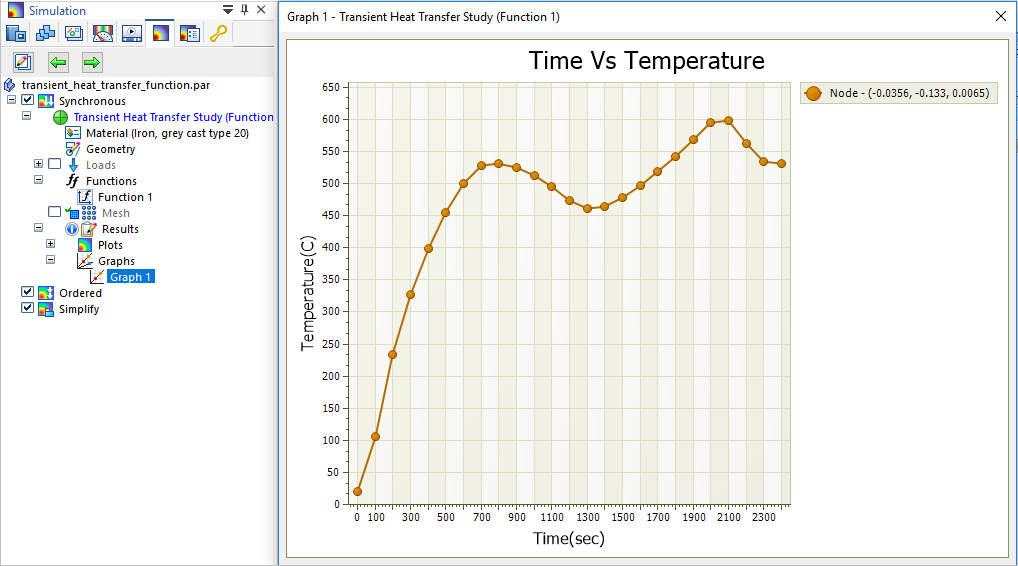 Probing the nodal data for this transient heat transfer study, this graph of Time Vs. Temperature resulted from the application of the function table shown above to the study geometry.