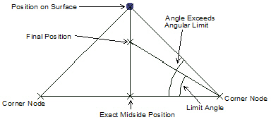If the limit distortion option is on, you must specify an angular limit to the distortion. Femap will calculate the position of the midside node on the surface, and then compare the resulting angles with the two corner nodes. If either of these angles is above the specified limit, Femap will recompute a new position for the node on the line between the exact midside position and the position on the surface, which creates an angle equal to the limit angle.